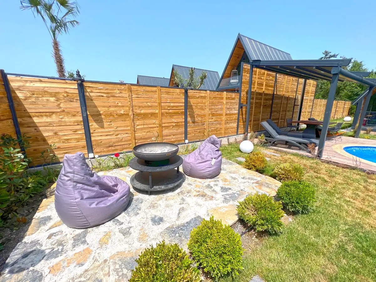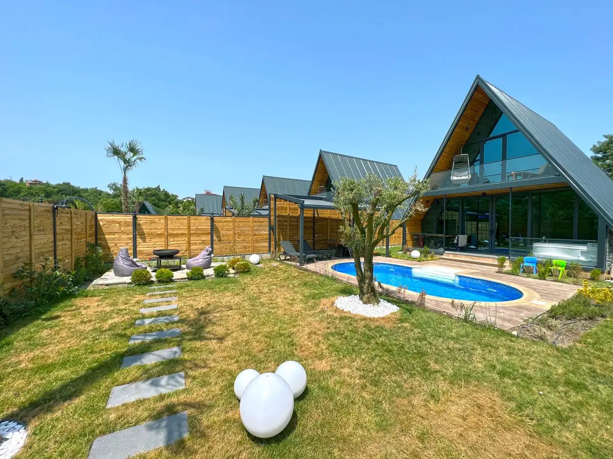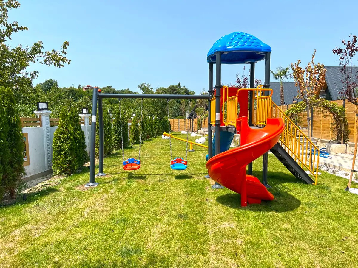 Bahçe: Özel ısıtmalı havuz (3m x 5m, derinlik 1,50m), şezlong, jakuzi, şemsiye, ateş kazanı, barbekü, salıncak, ortak alanda çocuk oyun parkı bulunmaktadır.