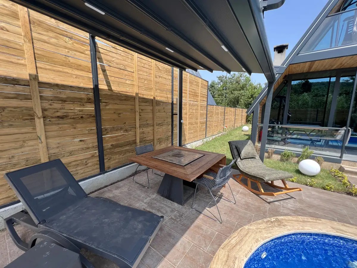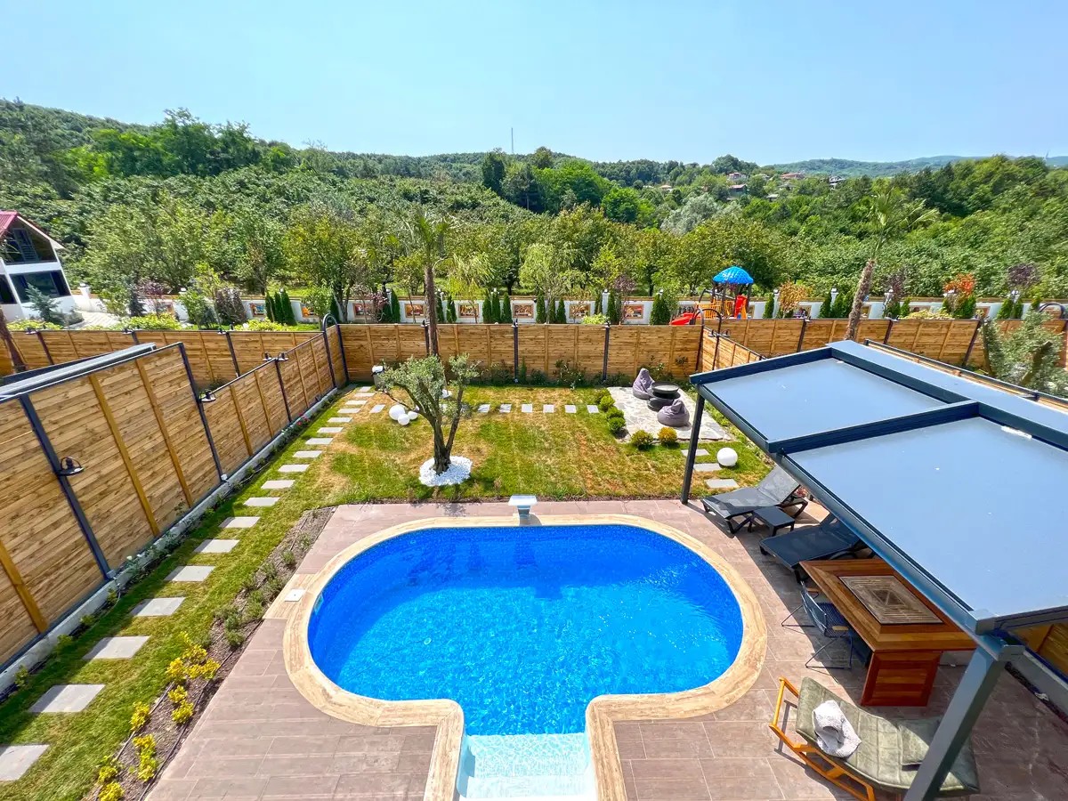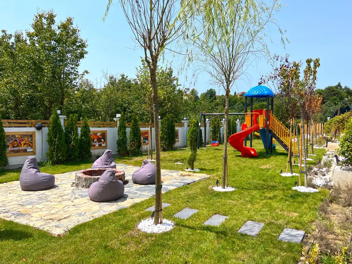 Bahçe: Özel ısıtmalı havuz (3m x 5m, derinlik 1,50m), şezlong, jakuzi, şemsiye, ateş kazanı, barbekü, salıncak, ortak alanda çocuk oyun parkı bulunmaktadır.