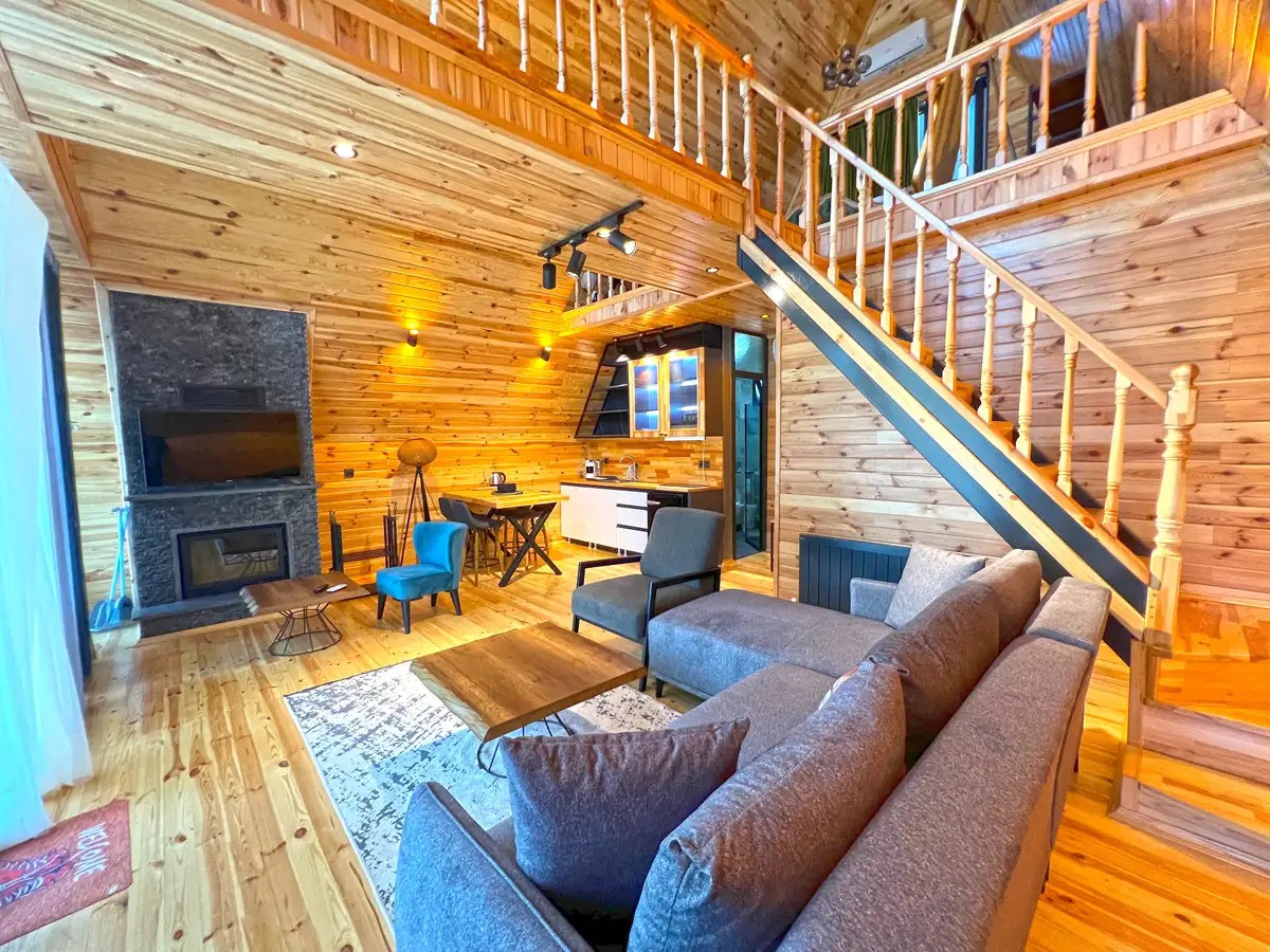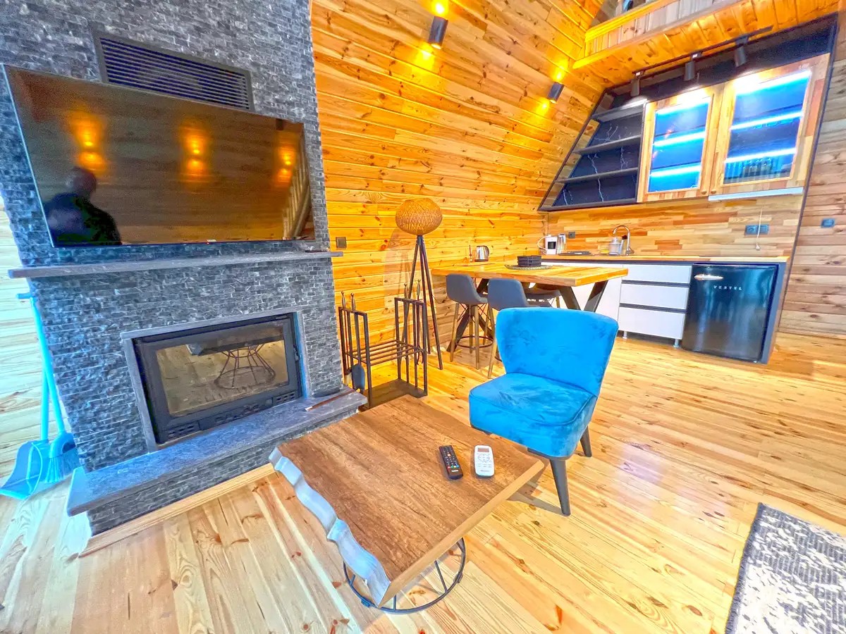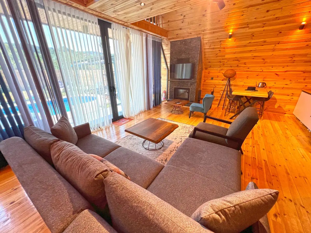 Salon: Açılır L koltuk, şömine, jakuzi, yemek masası, televizyon, wc & banyo, Wifi bulunmaktadır.