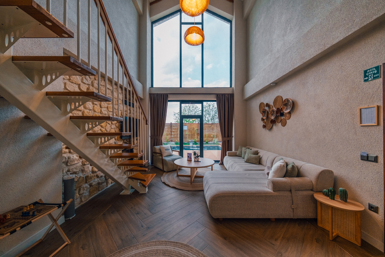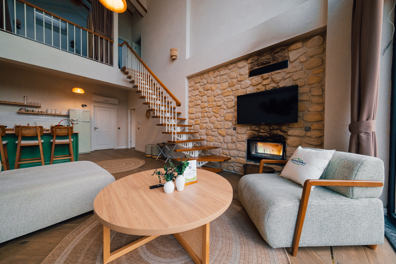 Salon: Açılamayan L koltuk, şömine, bebek beşiği, mama sandalyesi, yemek masası, wifi, TV(netflix), wc&banyo, hamam & Sauna bulunmaktadır.