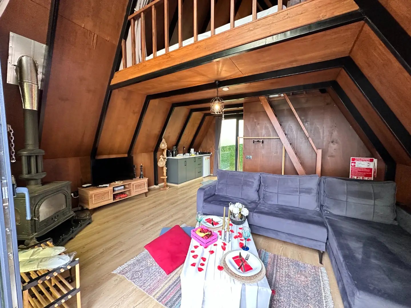 Salon: Rahat ve şık açılır L koltuk, Smart TV, klima, şömine soba, wifi, wc&banyo bulunmaktadır.