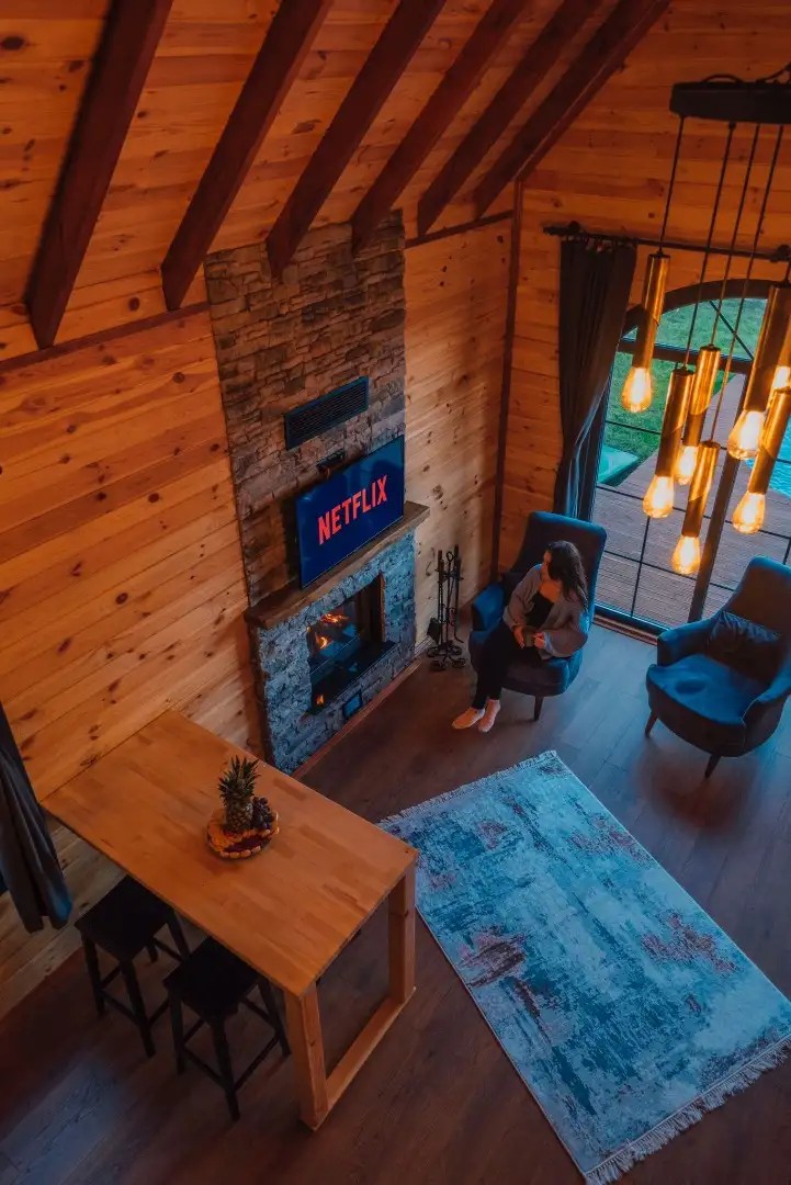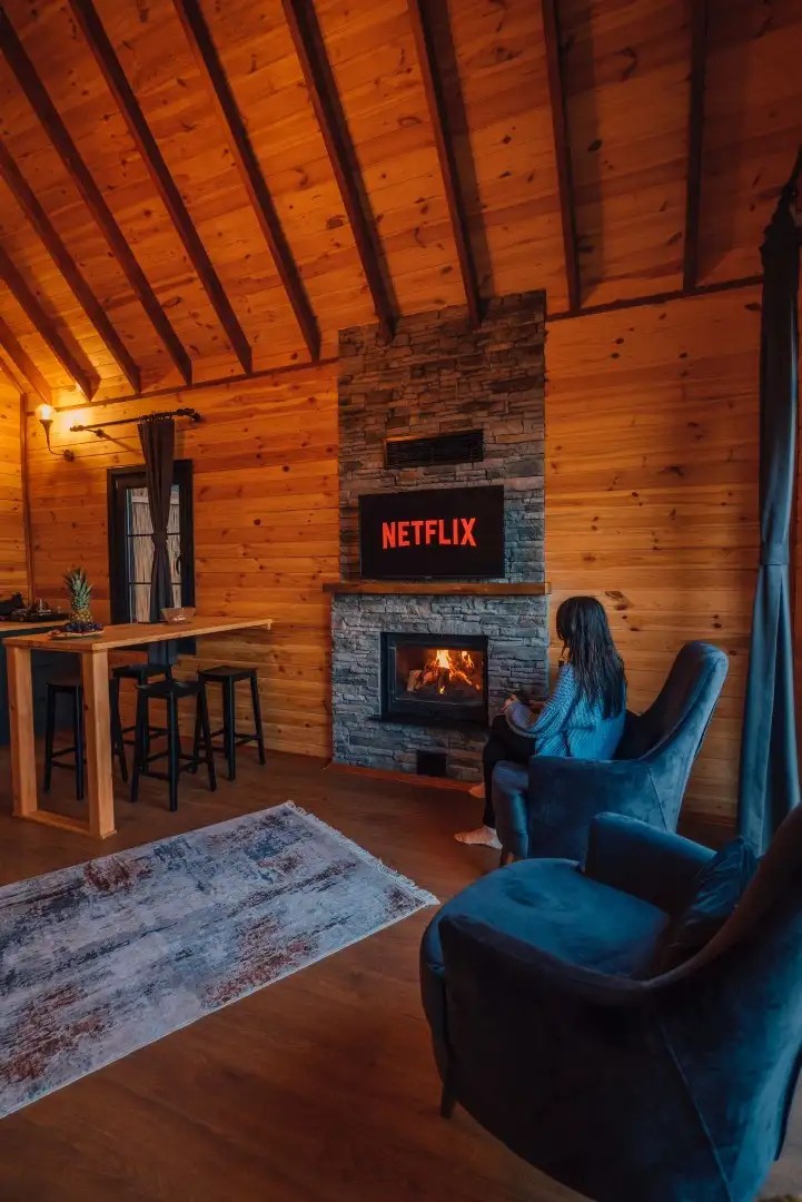 Salon: Açılabilen koltuk, TV (netflix desteklemektedir.), klima, şömine, 2 adet berjer bulunmaktadır.