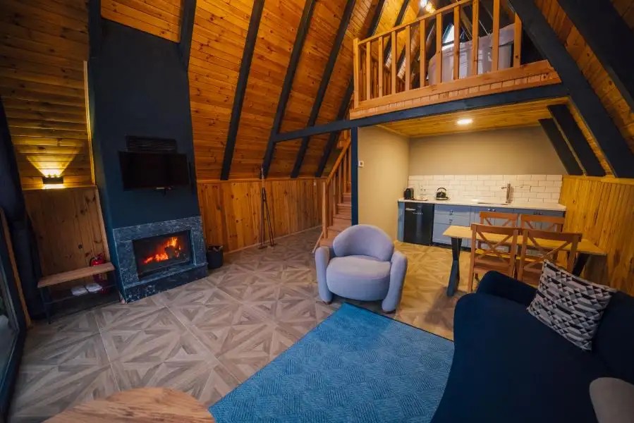 Salon: Açılır kanepe, şömine, yemek masası, televizyon, mama sandalyesi, wc & banyo bulunmaktadır.