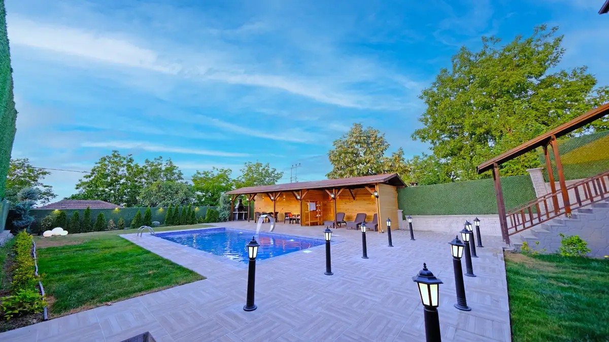 Bahçe: Isıtmalı Özel Havuz (4m x 8 m, derinlik 1,50) barbekü, bahçe mobilyası, ateş kazanı bulunmaktadır.