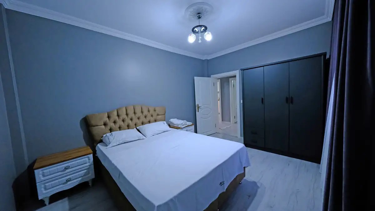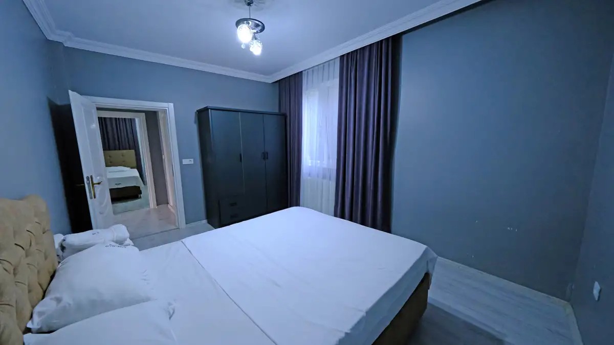 2. Yatak Odası: (Alt Kat) 1 çift kişilik yatak, 1 gardırop, 1 klima ve vestiyer bulunmaktadır.