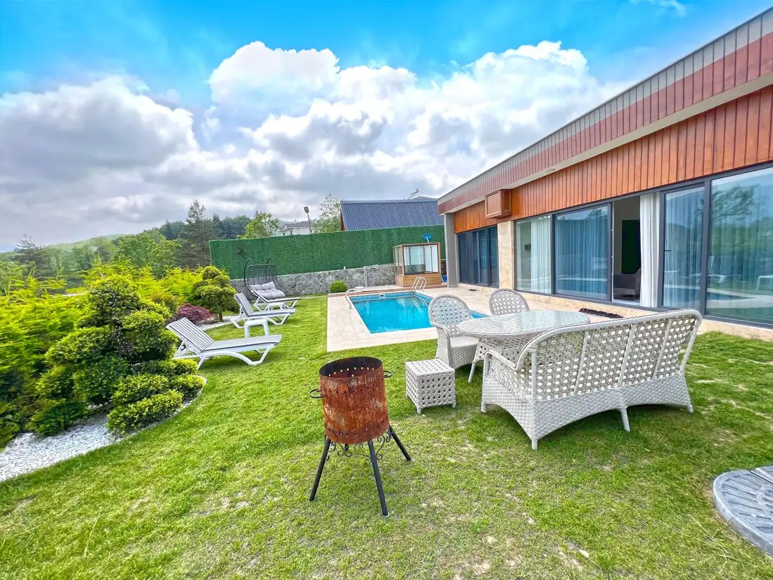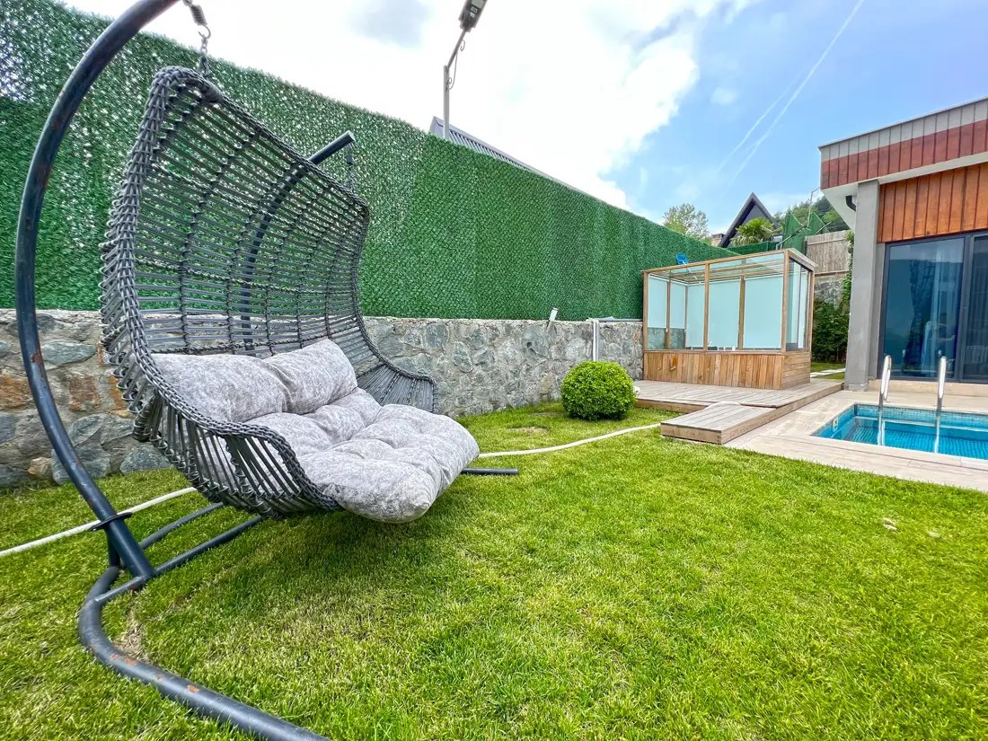 Bahçe: Küçük bahçeli, özel Isıtmalı havuz( 3,5 x 8 Derinlik: 1.50 ), jakuzi( üstü ve etrafı camla kapalı) şezlong, şemsiye, bahçe mobilyaları, barbekü bulunmaktadır.