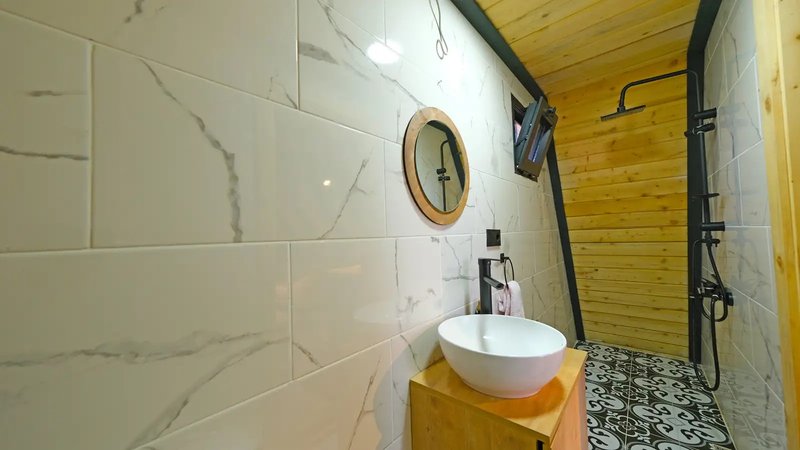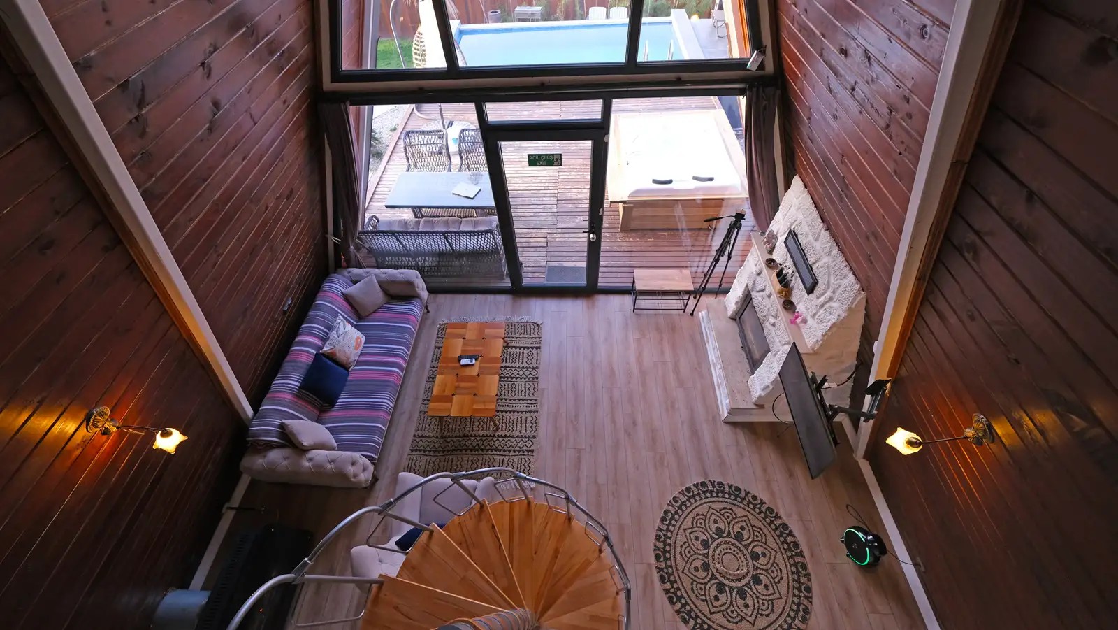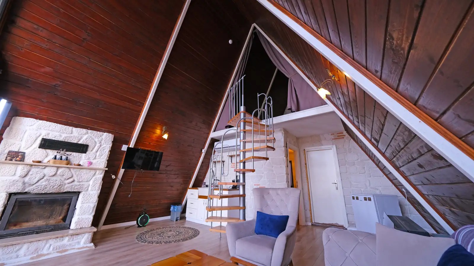 Salon: Açılabilir L koltuk, yemek masası, şömine, doğalgaz şömine, televizyon, wc& banyo bulunmaktadır.